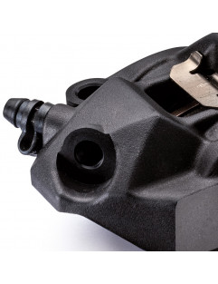 This monoblock caliper, obtained from a single piece of cast aluminium, is made with the most advanced casting and machining technologies in order to obtain a solid caliper body which is ultra light and has excellent stiffness and precision operating values. The hydraulics were given particular attention, as was the shape of the caliper body, both of which were the focus of technical fine-tuning. The caliper body, which houses four 34 mm diameter pistons, is characterised by significant stiffness values which are obtained thanks to the peculiarity of the triple bridge shape.