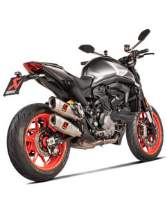 This product features two short mufflers, designed to emphasize the bike’s twin-engine configuration. The outer sleeves and collector are constructed from lightweight titanium, which are sandblasted for an optimal finish and visual appeal. The remaining parts are fabricated from high-grade stainless steel. This Euro 5 EC/ECE type-approved exhaust is a simple plug-and-play installation with no remapping involved. Serving up a deep and dynamic sound to highlight the bike’s engine, the power is increased by 1.6 kW (2.2 hp) at 8,800 rpm, with torque rising by 3.5 Nm at 3,100 rpm (when tested on the Akrapovič dyno in comparison to a Monster using a standard stock exhaust).An optional handmade, forged, carbon-fibre heatshield is available to provide an exclusive finishing touch to the exhaust. Designed to replace the stock aluminium version – which can still be fitted with the Akrapovič Slip-On Line (Titanium) – this heatshield is a very rare product in the motorcycle world. An optional link pipe made from stainless steel is also available, designed to raise power and torque levels, reduce weight, and increase gas flow. The Akrapovič Slip-On Line (Titanium) Exhaust System and Heat Shield (Carbon) for the Ducati Monster and Monster + has been awarded the highly prestigious 2022 Red Dot Award for Product Design.Installation of the optional link pipe (SS) makes EC/ECE type approval of the Slip-On Line (Titanium) invalid.