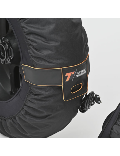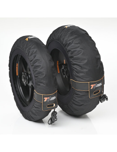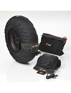 A competition tyre warmer model designed specifically for track use and based on the motoGP tyre warmers: the exterior is made from polyester fabric with cordura-effect processing, and the interior from Nomex fabric; the electric circuit is laid transversally on the side, and longitudinally in the centre, thus ensuring an even temperature throughout the tyre of 80°C. Available with external control unit.