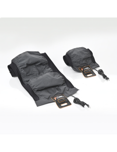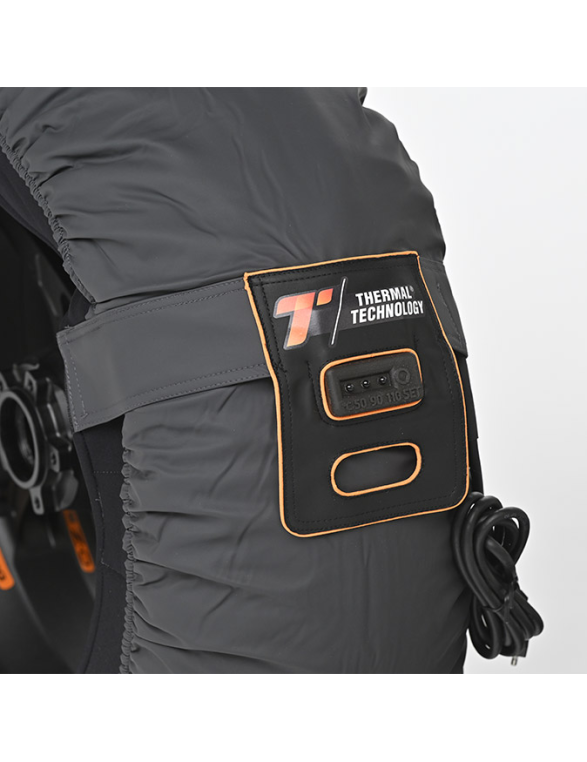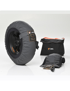 Tyre warmer for motorcycle racing with electronically controlled temperature from the control unit inserted on the tie-strap. It allows adjustment on three pre-set levels, 50°C – 90°C – 110°C with a LED indicator and selection key.