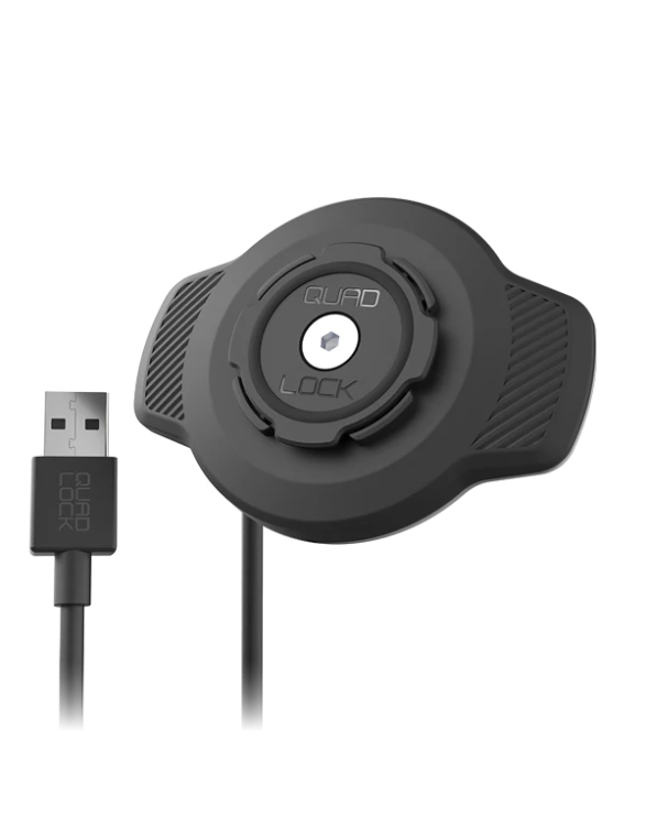 The Quad Lock Weatherproof Wireless Charging Head comes with everything needed to install with your Quad Lock Motorcycle Mount (sold separately). It also comes with USB-A to USB-C cables to charge directly with your bike's USB power source