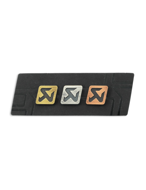 Misiņa, sudraba un vara piespraudes ar izgrieztu Akrapovič logotipu. Var izmantot uz T-krekliem un cita apģērba.