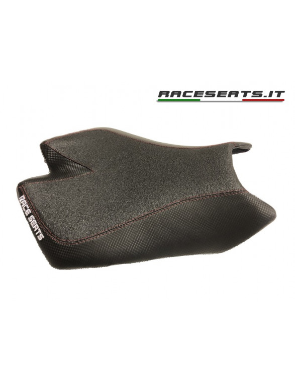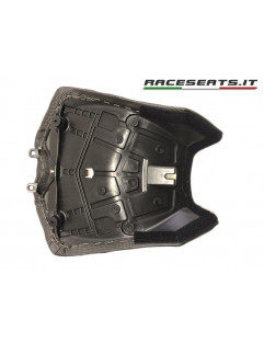 Sportisks sēdeklis veidots uz OEM plastmasas pamatnes un porolona, ar pārvalku, kas veidots no GRIP materiāla, kas nodrošina neslīdēšanu un labu saķeri tajā paša laikā ļaujot viegli mainīt sēdpozīciju. Dubultas sarkanas šuves nodala GRIP daļu no sānu daļām, kas veidotas no materiāla ar karbona šķiedru efektu, kas izceļ Aprilia motociklu eleganci un sportisko izskatu.